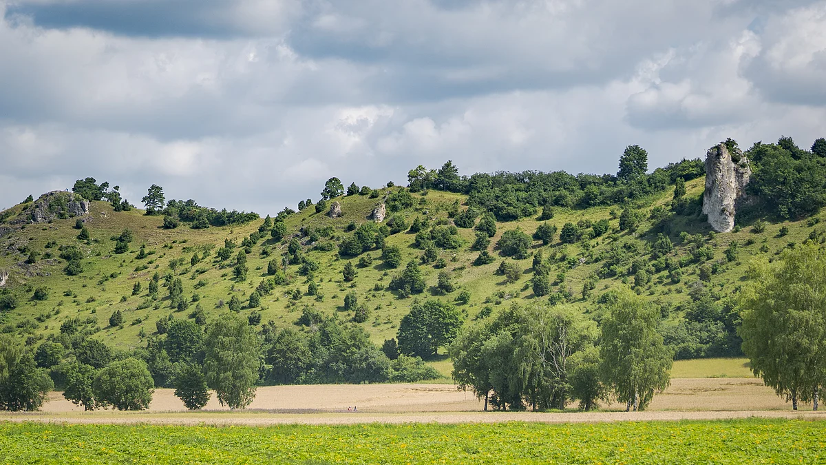 Im Norden ist vom Standort der Nummerntafel hinter Dollnstein ein steiler Hang zu erkennen. Die Talhänge in Richtung Nordosten und Westen sind ebenfalls sehr steil. Nur geringes Gefälle hingegen hat der Bergsporn, auf dem wir stehen.