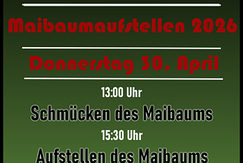 Am Dienstag den 30.04 ist es wieder soweit - der Maibaum 2026 wird eingeholt, geschmückt und aufgestellt. Wie jedes Jahr hoffen wir wieder auf zahlreiche Unterstützung, um den Baum traditionell mit Muskelkraft aufzustellen. Los geht's um 13:00 Uhr mit dem Schmücken des Baumes. Ab 15:00 Uhr ...