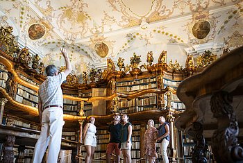 Jeder Besucher ist fasziniert vom ersten Anblick des historischen Saals der staatlichen Bibliothek. Kein Wunder, befindet sich darin doch eine zweigeschossige Emporenbibliothek aus der Mitte des 18. Jahrhunderts, kunstvoll gefertigt von Augsburger Meistern für das Zisterzienserkloster Kaisheim ...