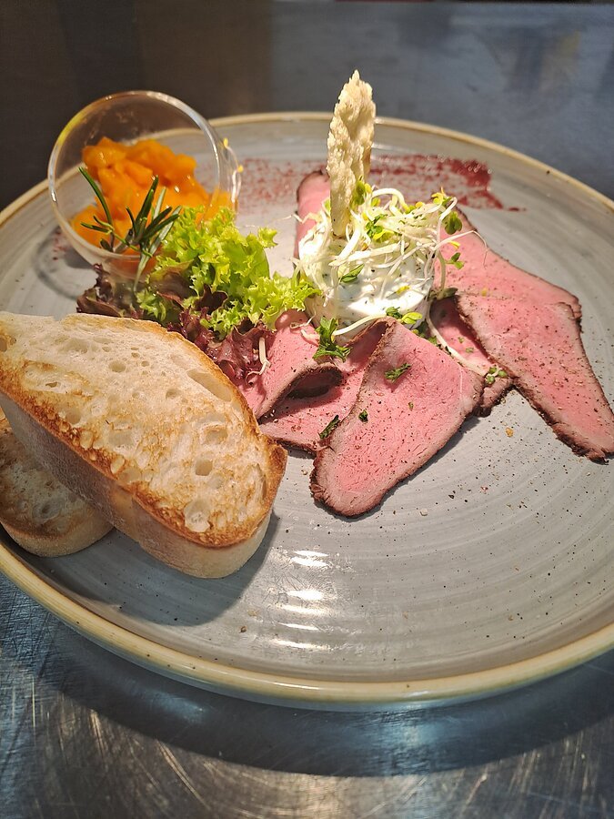 Teller mit Roastbeef, Salat, Brot, Frischkäse mit Sprossen und einem kleinen Glas mit orangener Sauce.